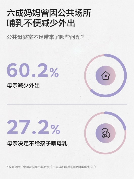 據(jù)中國(guó)發(fā)展研究基金會(huì)發(fā)布的《中國(guó)母乳喂養(yǎng)影響因素調(diào)查報(bào)告》顯示,60.2%的母親曾因在公眾場(chǎng)所哺乳不便而減少外出。找不到、不夠好的母嬰室,困住了媽媽們。