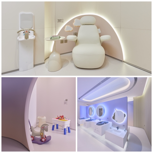 步入鄭州機(jī)場(chǎng)母嬰室內(nèi),媽媽們的第一感受是被寧?kù)o和放松包裹。潔凈的白、柔和的光,在低明度和低飽和度色彩下,新母嬰室的氛圍溫和恬靜,空間分區(qū)逐步從開(kāi)放過(guò)渡到私密,讓媽媽們更安心放松,也能讓爸爸在內(nèi)的家庭成員們參與喂食、換尿布,實(shí)現(xiàn)真正的“全員育兒”。